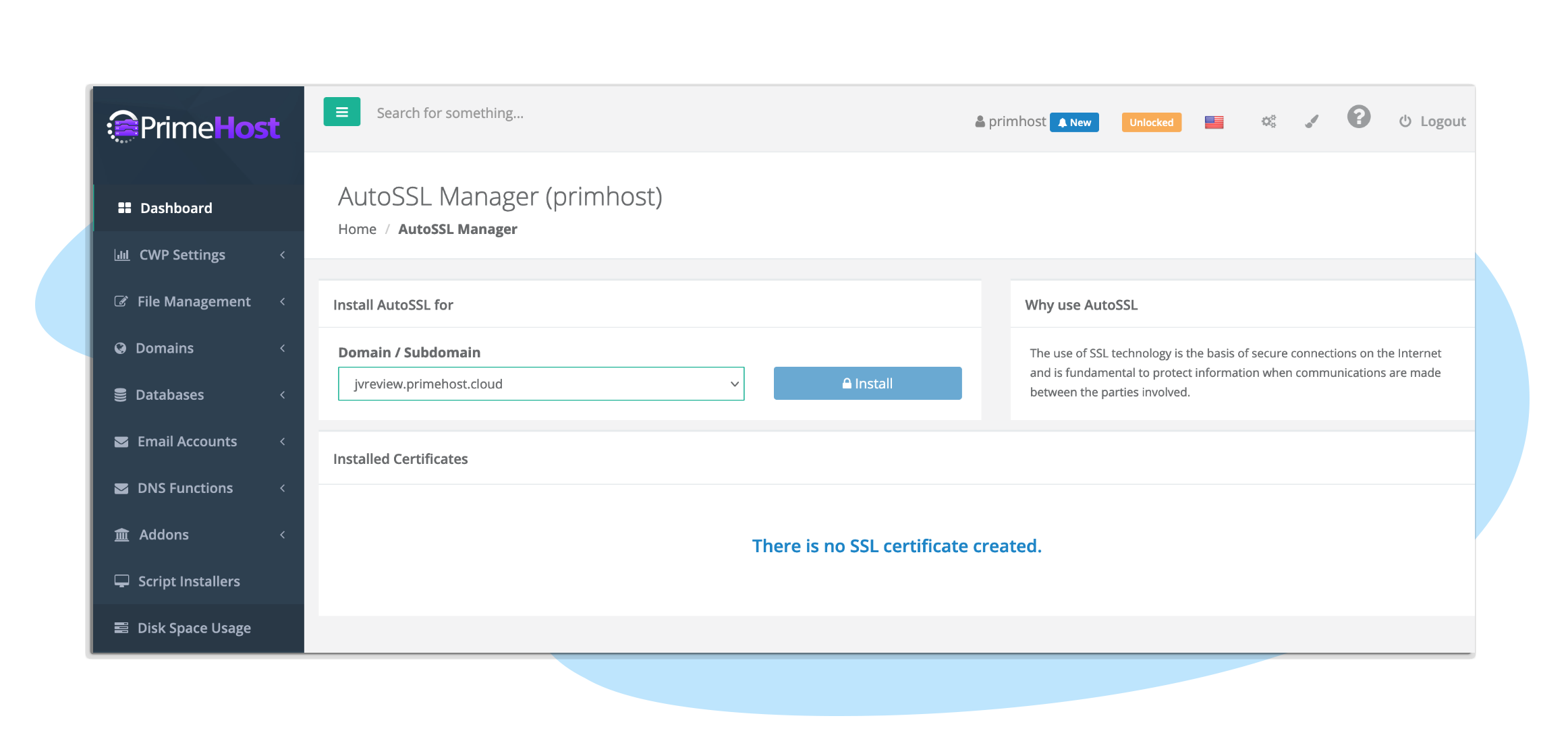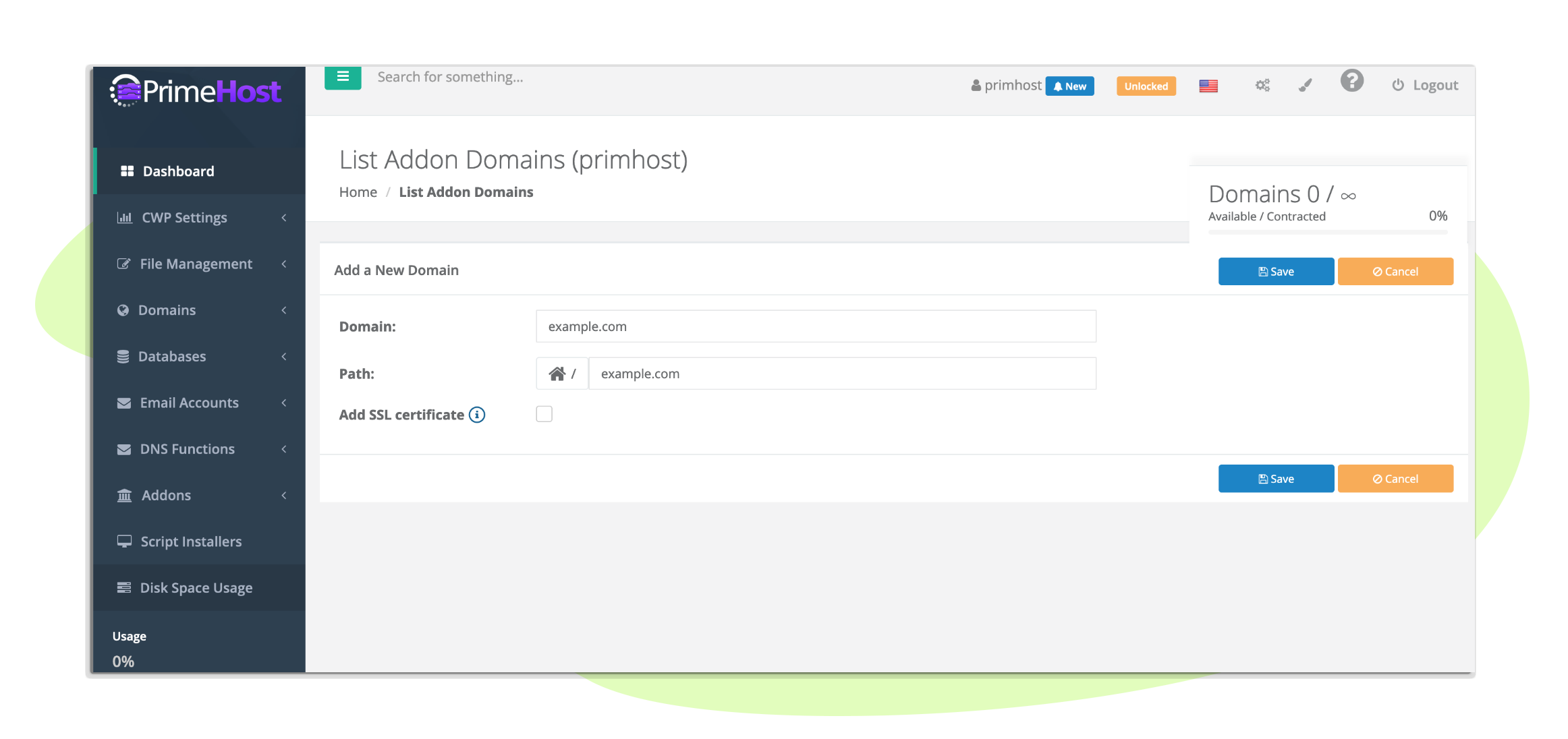 Faça login em sua conta PrimeHost na nossa platadorma ultra-segura e insira seu nome de domínio. Você pode adicionar domínios e sites ilimitados.